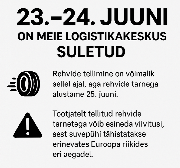 Täiustage oma rehvide hulgimüügikogemust meie tõhusa tellimiskeskkonnaga. Tyreorder pakub sujuvat platvormi kiirete ja mugavate hulgitellimuste tegemiseks. Kogege sujuvat protsessi alates toote valikust kuni ostukorvini, tagades, et teie tehingud on kiired ja usaldusväärsed. Lisaks saate kasu kiirest kohaletoimetamisest meie heade tarnepartnerite (DPD, Itella, Venipak) kaudu, kes tagavad teie tellimuste saabumise.